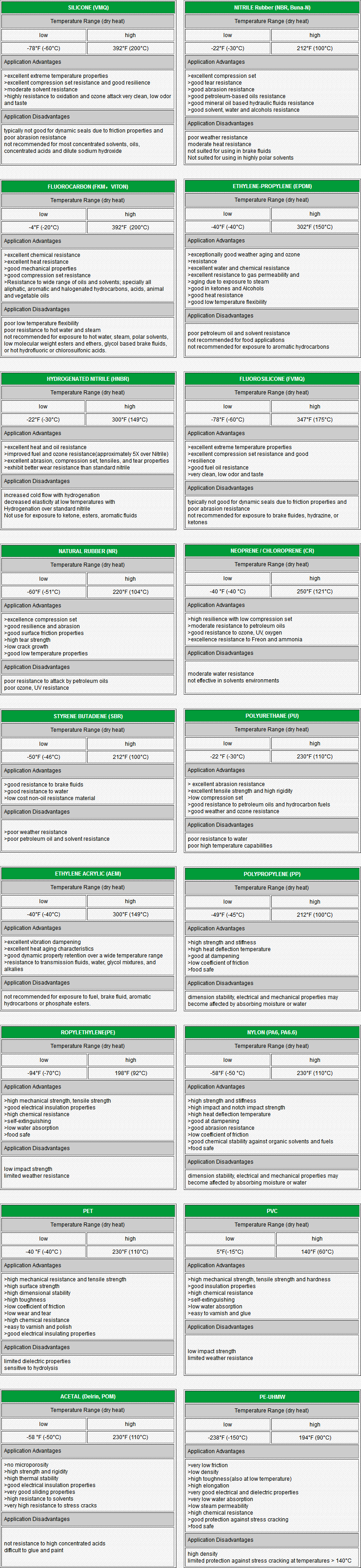| SILICONE (VMQ) | NITRILE Rubber (NBR, Buna-N) | FLUOROCARBON (FKM,VITON) | ETHYLENE-PROPYLENE (EPDM) | |